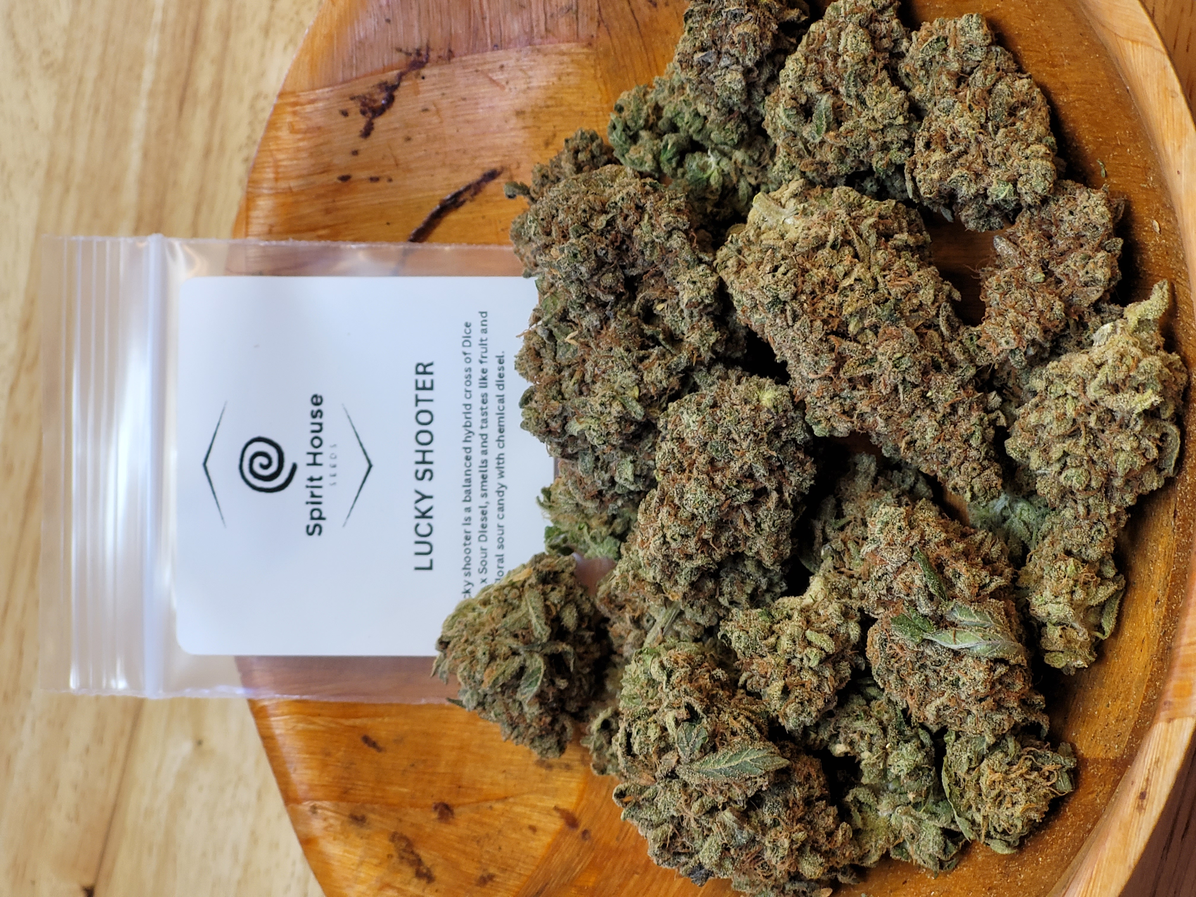 LUCKY SHOOTER, is a balanced hybrid, fast finishing, medium stretch with golf ball shape nugs. smells and tastes like fruit and floral sour candy with chemical diesel.